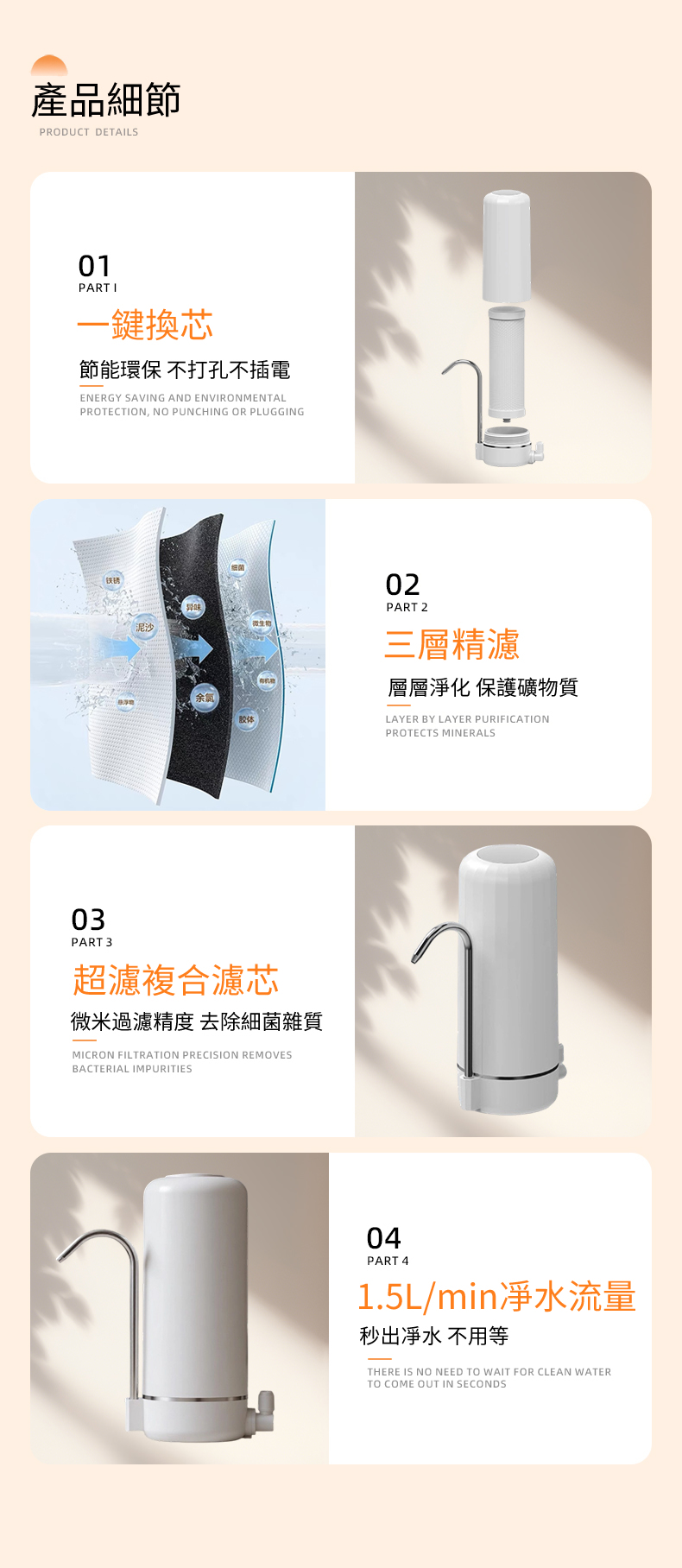 • 1.5L/min凈水流量,秒出凈水 不用等